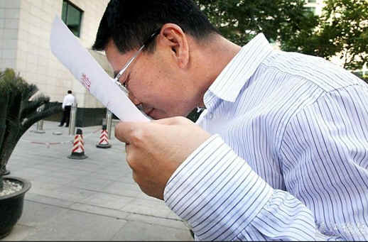 5月27日下午,国家发改委正式核准广东湛江钢铁基地项目动工建设。图为湛江市长王中丙在国家发改委门前难抑激动亲吻批复文件。