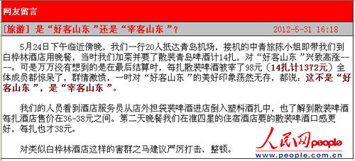 人民网济南6月7日电 6月3日,人民网地方领导留言板上有这样一条留言:“5月24日下午临近傍晚,我们一行20人从福建抵达青岛机场,接机的中青旅陈小姐即带我们到白桦林酒店用晚餐,当时我们加菜并要了散装青岛啤酒计14扎,对‘好客山东’兴致高涨。可是万万没有想到的是在最后结算时,每扎散装啤酒被宰了98元(14扎计1372元)全体成员都惊呆了,群情激愤,一时对‘好客山东’的美好印象荡然无存,都说:这不是‘好客山东’,是‘宰客山东’!”>>『详细』