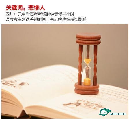 二 四川广元中学一高考考场时钟失灵,时间比实际时间慢了半个小时。语文考试中,监考老师通知“还剩15分钟”时实际上时间应该还有45分钟左右,有的学生还没有开始写作文。受到影响的学生数量为30人。