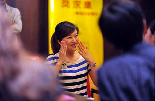 2012年6月25日,“蜀地女富豪诚征男主人”活动在成都启动,36位财富上千万的四川女富豪将面向全国征婚。穿蓝白条纹衫的女子为现场征婚的女富豪之一。