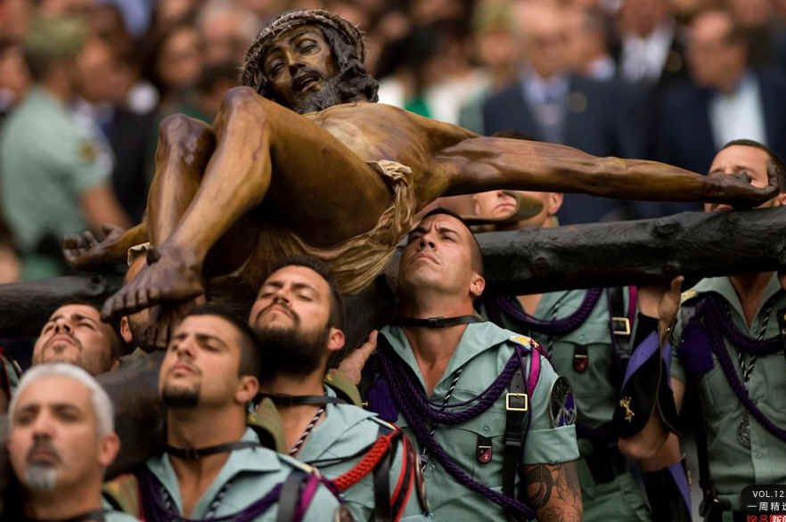 当地时间4月5日,西班牙南部城市马拉加,军人们抬着“耶稣受难”雕像前往教堂纪念耶稣受难日。AFP PHOTO/JORGE GUERRERO