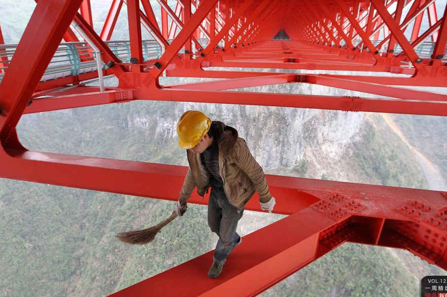 3月31日,湖南吉首市矮寨镇,施工人员清扫矮寨大桥钢桁梁上的垃圾尘土。当天,矮寨特大悬索桥正式建成通车。该桥长1176米,跨高350米,为目前世界峡谷跨径最大悬索桥。刘尚文/CFP