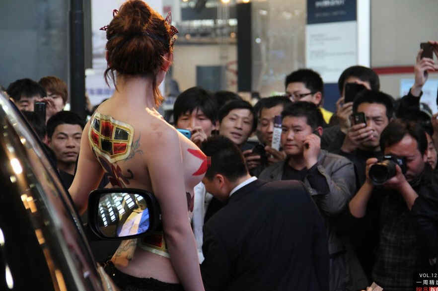 4月6日,郑州春季车展,一名上半身全裸的模特展示人体彩绘,吸引了众多目光。111/东方IC