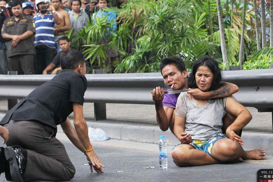 当地时间4月5日,泰国曼谷街头,警察试图解救人质。一名男子劫持了自己的妻子,在经过长达6个小时的对峙后,警察使用泰瑟枪将男子麻痹,解救出人质。据了解,该男子是一名吸毒者。AP Photo/Sakchai Lalit