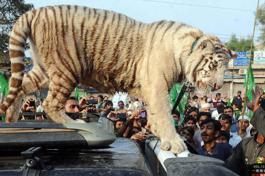 当地时间3月31日,巴基斯坦拉合尔,一只老虎被抗议者拴在车顶参加示威活动。当日,众多市民集结,抗议该市大范围的电力短缺。AFP PHOTO/Arif ALI
