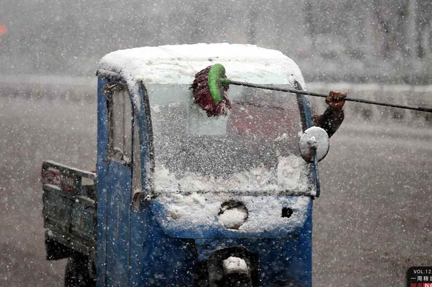 4月2日,河北秦皇岛,一名司机用拖把清除车窗上的积雪。