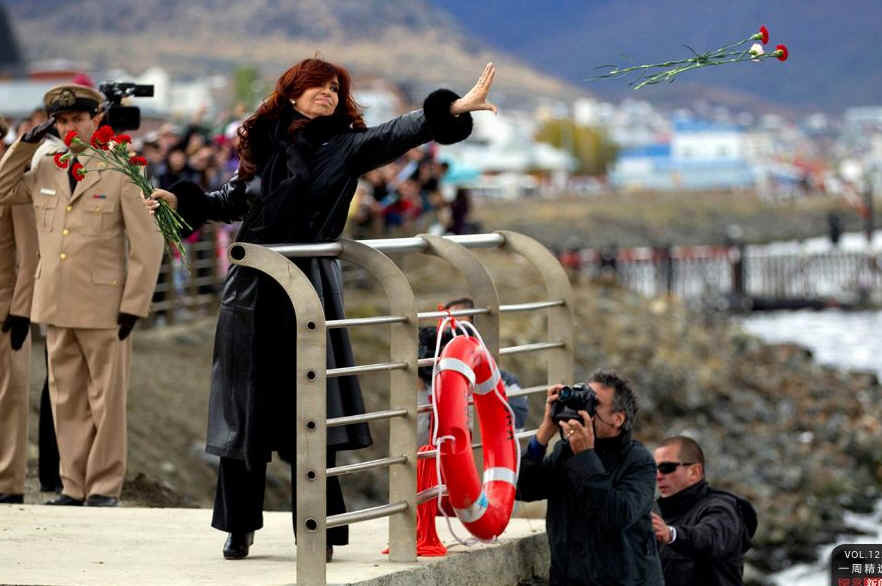 当地时间4月2日,阿根廷乌斯怀亚,阿根廷女总统克里斯蒂娜向两主岛之间的海峡抛洒鲜花,纪念马岛战争爆发30周年。