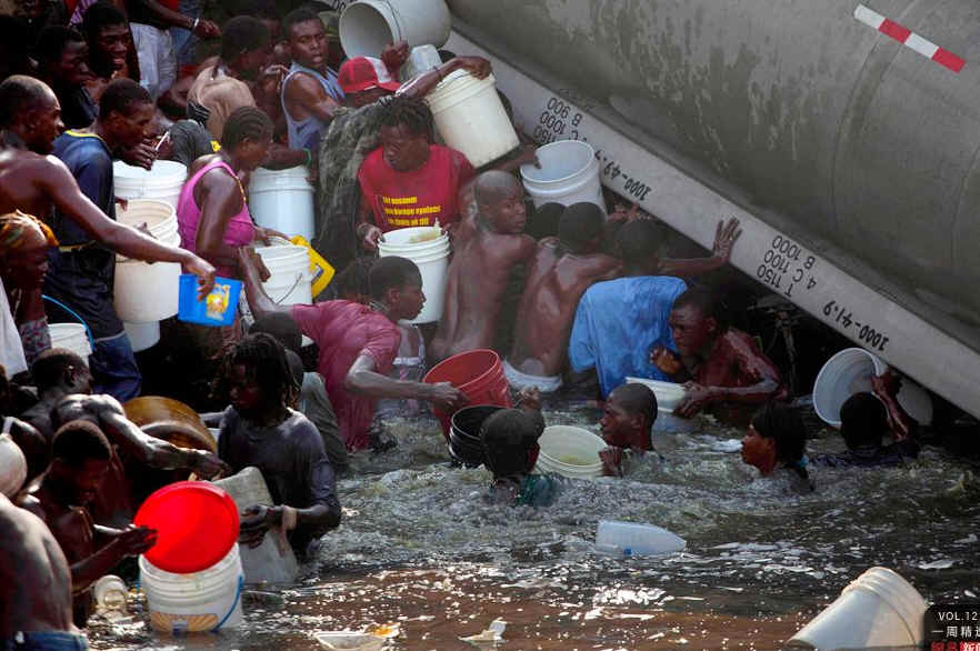 当地时间4月3日,海地太子港,一辆装载柴油的卡车发生车祸,掉入河中,民众在河中争先收集柴油。在海地,燃料的价格为5美元一加仑,而绝大部分的民众每天收入只有2美元。AP Photo/Ramon Espinosa