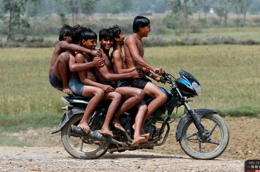 当地时间4月4日,印度北方邦的Chachura,一辆摩托车上坐了6名男孩。 REUTERS/Parivartan Sharma
