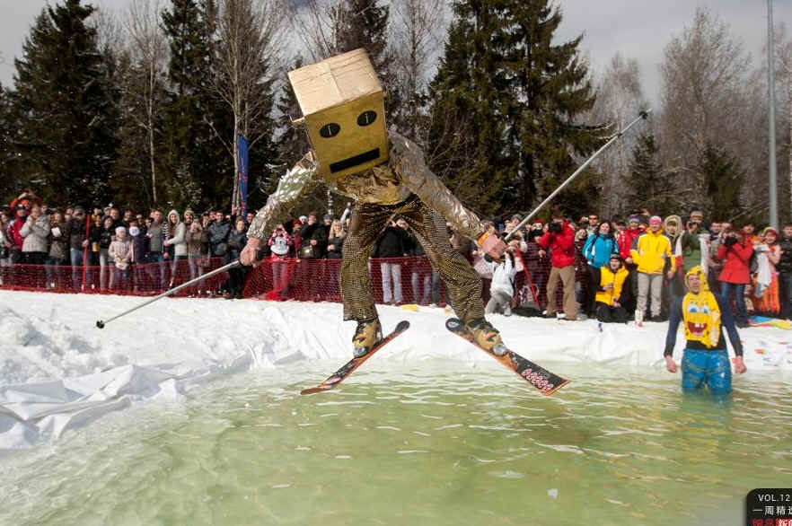 当地时间4月1日,白俄罗斯首都明斯克附近的Silichi滑雪胜地,一名滑雪者跳入融化的雪水中。当天,许多人在Silichi以“最后一跳”庆祝滑雪季的结束。REUTERS/Stringer