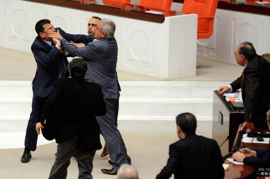 当地时间3月31日,土耳其安卡拉,执政党和反对党的议员在议会辩论中扭打在一起。当天的议会围绕着一项教育法案的改革进行。该法案主张放宽伊斯兰学校招生年龄限制,并将义务教育时间由8年延长至12年。执政党认为,法案有效延长了学生受教育时间,而反对党认为执政党是借该法案扩大宗教影响。辩论期间,两名议员因意见不合大打出手。最终,该法案以295票赞成、91票反对在议会获得通过。REUTERS