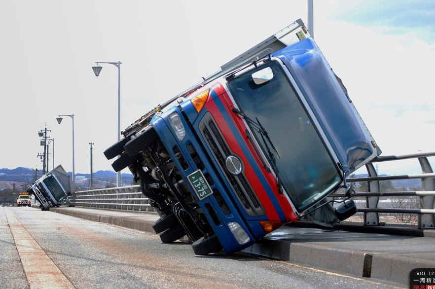 当地时间4月3日,日本富山县砺波市,重型卡车因强风发生侧翻。当日,50年来最强风席卷大半个日本,到4月3日夜20时,日本全国已知有3人死亡,305人受伤。AFP PHOTO/JIJI PRESS