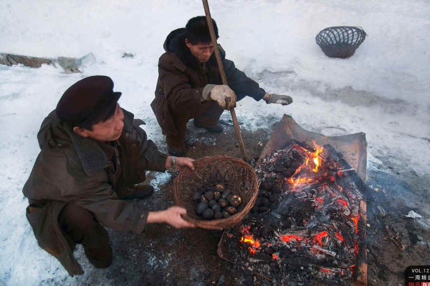 当地时间4月3日,朝鲜三池渊,两名为当地酒店工作的男子用当地的传统方法烤土豆。这些烤土豆将供应给外国游客。AP Photo/David Guttenfelder