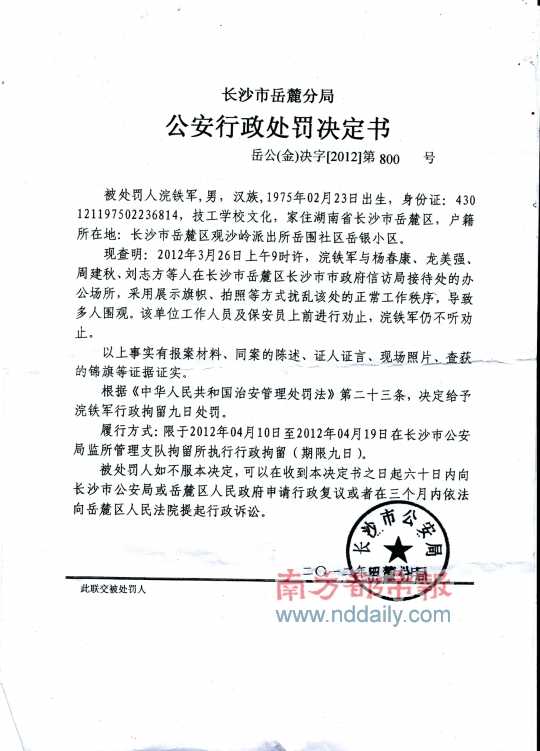 从在其微博上贴出的《公安行政处罚决定书》中可以看出,出具该决定书的是长沙市公安局岳麓分局。这份处罚决定书透露,“2012年3月26日上午9时许,浣铁军与杨春康、龙美强、周建秋、刘志方等人在位于长沙市岳麓区的长沙市市政府信访局接待处办公场所,采用展示旗帜、拍照等方式扰乱该处的正常工作秩序,导致多人围观,该单位工作人员及保安上前进行劝止,浣铁军仍不听劝止”。