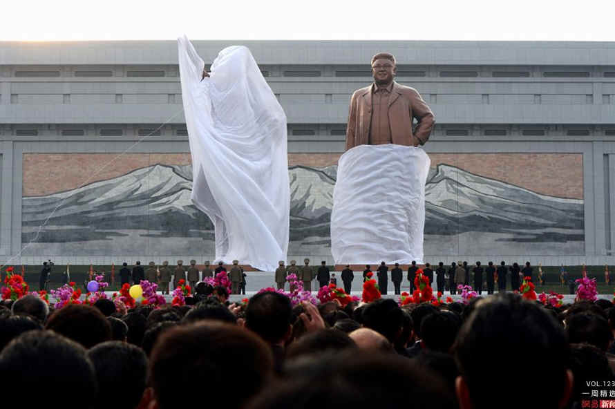 当地时间4月13日,朝鲜平壤,朝鲜最高领导人金正恩为金日成和金正日的铜像揭幕。当天揭幕的金正日铜像与金日成铜像并立,铜像上金正日身着生前最喜爱穿的“人民服”,外罩大衣,左手叉腰,面带微笑面向前方。金日成的铜像在1972年4月已经建立,而金正日的铜像是新制作的。AFP PHOTO/PEDRO UGARTE