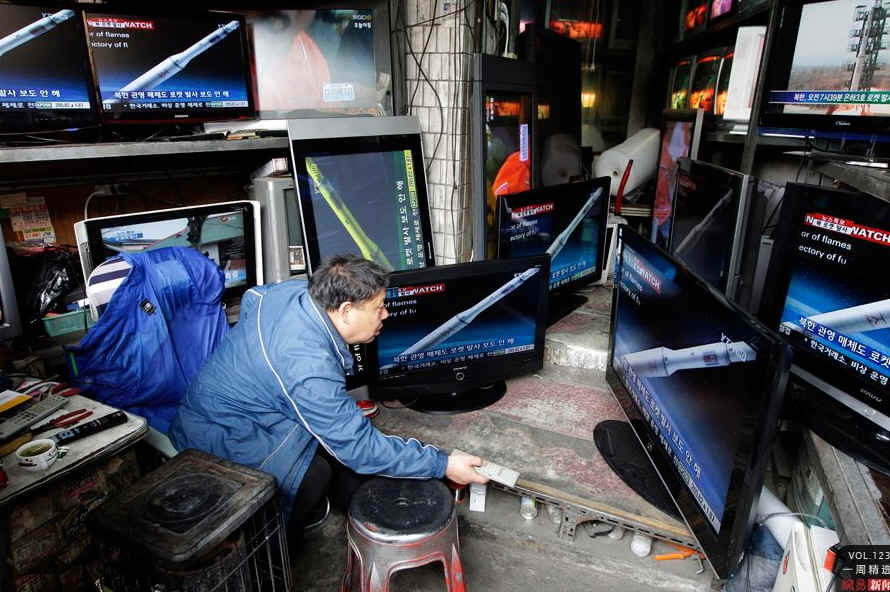 当地时间4月13日,韩国汉城,一个男人在电视前观看朝鲜卫星发射的计算机模拟画面。当天,朝鲜宣布卫星发射失败。韩军方人士称,火箭碎片坠入距离韩国西南部港口城市群山以西190至200公里的海域。Associated Press/Lee Jin-man