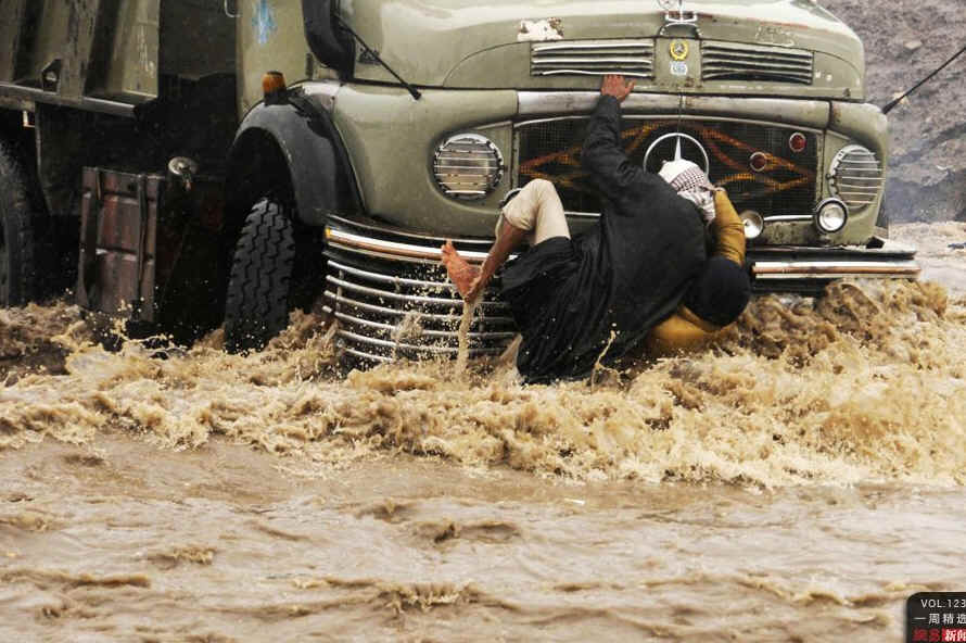 当地时间4月9日,也门首都萨那,大雨导致部分街区无法通行。市区北部,在水中跌倒的行人爬上汽车。当日,萨那普降大雨,由于市内排水设施能力有限,首都部分街区积水超过半米,多个街区的道路无法通行。新华社/默罕默德