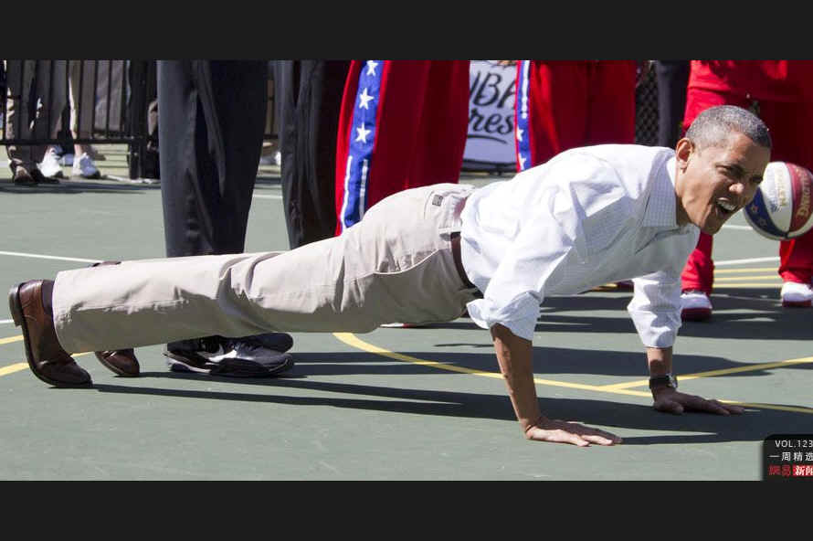 当地时间4月9日,美国华盛顿,美国总统奥巴马在白宫南草坪主持复活节滚彩蛋活动。奥巴马同美国退役篮球运动员一起做俯卧撑热身,参加哈林篮球队的活动。REUTERS/Kevin Lamarque