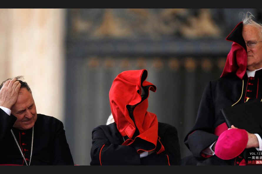 当地时间4月11日,梵蒂冈,一阵风“袭击”了三名神父。REUTERS/Tony Gentile
