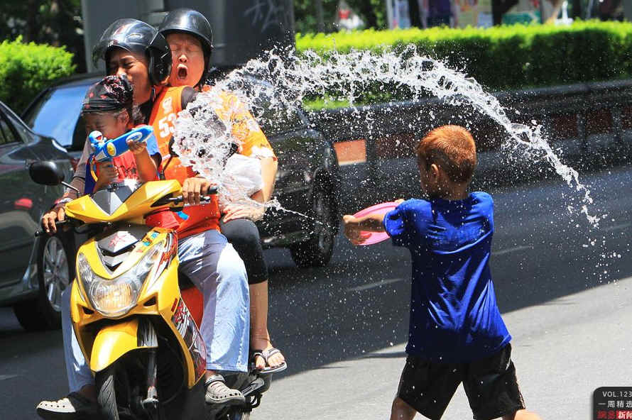 当地时间4月13日,泰国曼谷,一个男孩将水泼向骑着摩托车的人。这一天是泰国泼水节,该节又称"宋干节",在每年的4月13日,历时三天,是泰国的重要节日。AP Photo/Sakchai Lalit