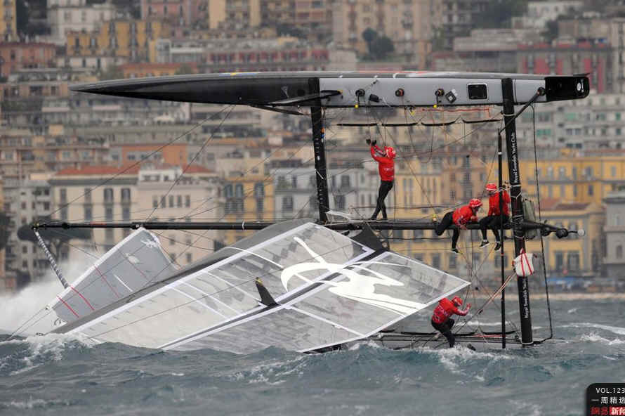 当地时间4月11日,意大利那不勒斯,阿蒂米斯队的水手们在美洲杯系列赛第一站那不勒斯站中翻船。AFP PHOTO / MARIO LAPORTA