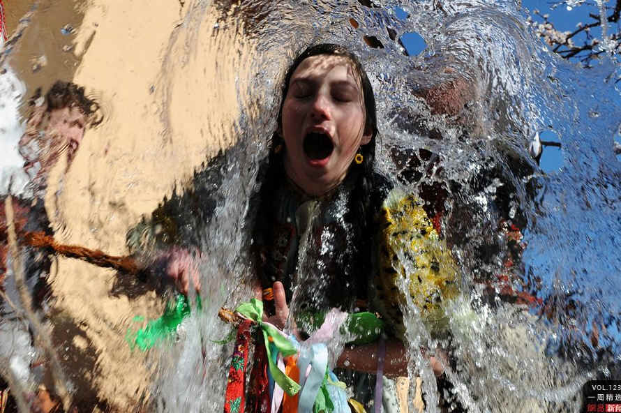 当地时间4月9日,斯洛伐克,布加迪斯拉发以北145公里的村庄,年轻人庆祝复活节。他们将水泼向女人,用杨柳枝轻击他们。以迎接代表着青春、力量和美丽的春天。AFP PHOTO/SAMUEL KUBANI