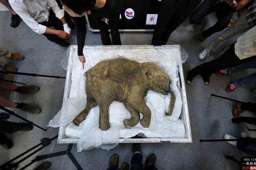 4月10日,中国香港,媒体观赏一个保存完好的小猛犸Lyuba。Lyuba的“寿命”有40000年历史,2007年被发现于俄罗斯亚马尔半岛。REUTERS/Tyrone Siu