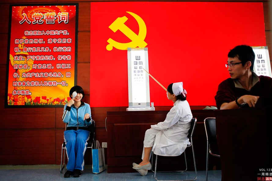4月9日,广东惠州第一人民医院,高考考生们开始进行体检,一名女生在党旗下测试视力。CFP