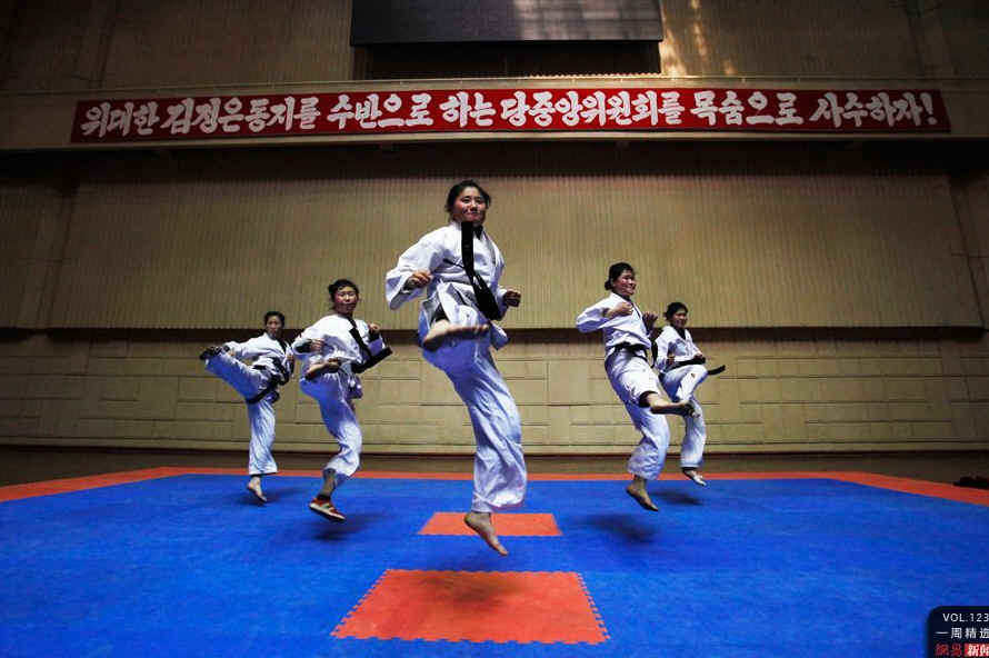 当地时间4月12日,朝鲜平壤,跆拳道大厅内,学生们刻苦训练。她们身后的横幅上写着“用我们的生命去保卫党中央领导金正恩同志”。REUTERS/Bobby Yip