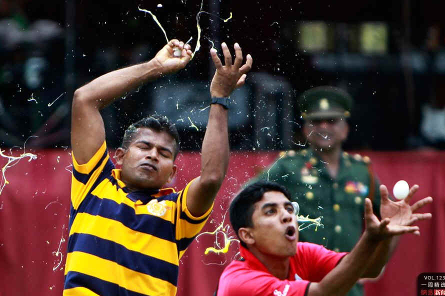 当地时间4月10日,斯里兰卡科伦坡,军人们互相投掷鸡蛋。这一天,是僧伽罗和泰米尔新年。这个节日的含义是“收获季节的结束”。AP Photo/Gemunu Amarasinghe