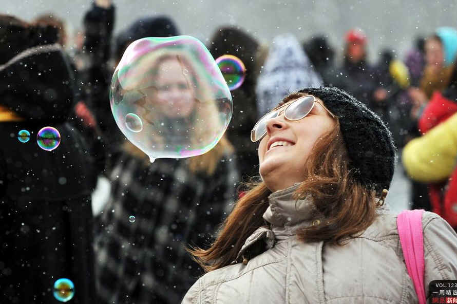 当地时间4月9日,俄罗斯圣彼得堡,民众在圣彼得堡广场聚集,举行吹泡泡快闪活动。意大利等国也曾通过吹泡泡快闪活动迎接春天。Photo ITAR-TASS/Ruslan Shamukov