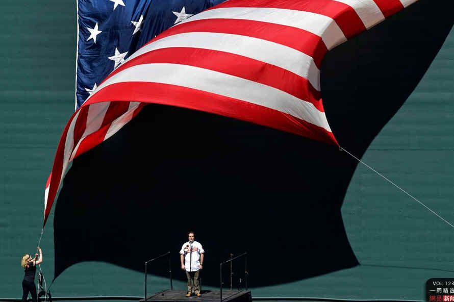 当地时间4月6日,美国巴尔的摩,歌手演奏国歌时,一名女子拉开一张美国国旗。巴尔的摩金莺队将在这里迎战来访的明尼苏达双城队。AP Photo/Patrick Semansky