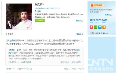 从5月3日发了第一篇微博开始,个人简介为河南政协常委、民革河南省委员的网友“赵克罗”关于南阳平坟的微博就没有停过。他发的关于平坟微博广为扩散,网友杨桐的转载更是被转发6000多次。