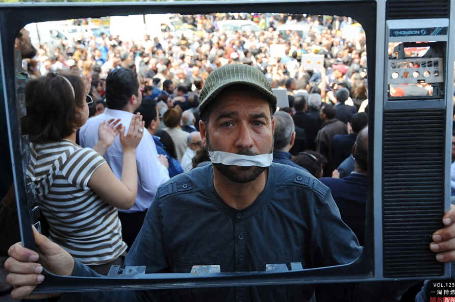 当地时间4月25日,突尼斯首都突尼斯市,一名记者举着电视框抗议。AFP PHOTO/FETHI BELAID