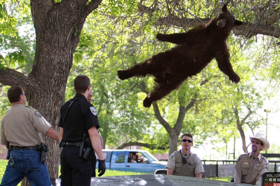 当地时间4月24日,美国科罗拉多州大学波德分校,一只闯入校园的黑熊被麻醉枪击中后,坠落到软垫上。这只黑熊重约90公斤,闯入校园后在一棵大树上安下“家”来。当地的野生动物部门工作人员称,该黑熊也许是从附近山区跑来寻找食物的。AP Photo/CU Independent,Andy Duann