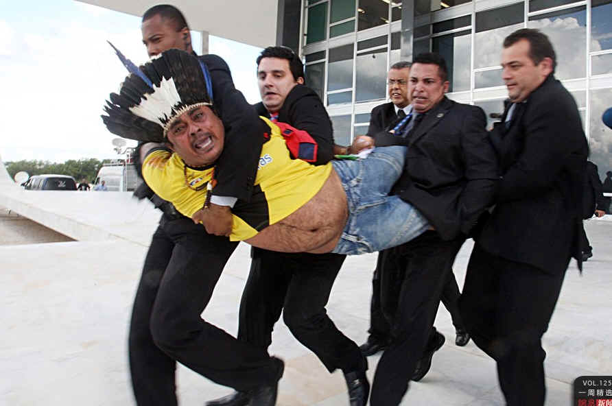 当地时间4月26日,巴西首都巴西利亚,一名印第安人被强制从联邦最高法院抬出。当日,联邦最高法院就公立大学为其他种族人分配名额作出了裁决。一名印第安人因不满裁决,向一位部长咆哮。ANDRE DUSEK/AGENCIA ESTADO/IC