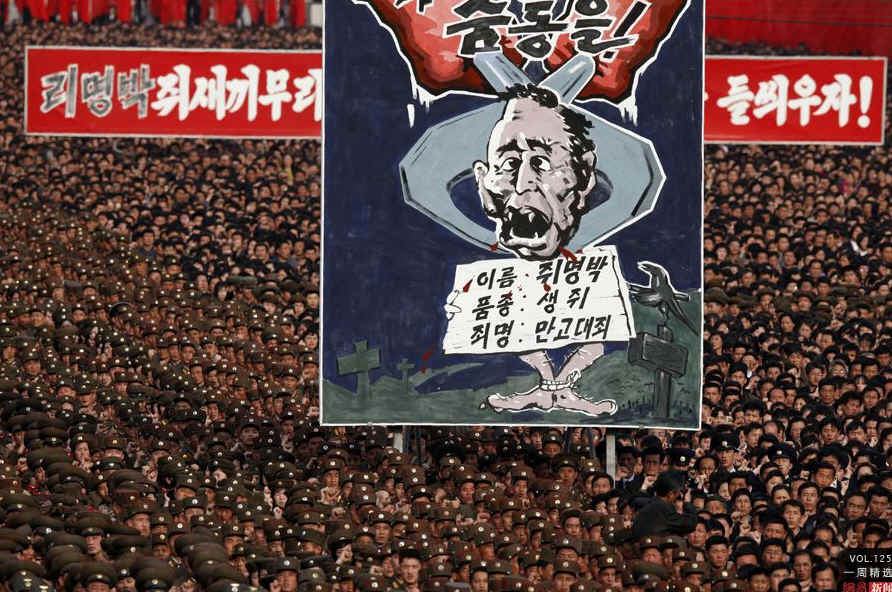 当地时间4月20日,朝鲜平壤,军人举起一幅关于韩国总统李明博的漫画。当日,朝鲜举行10万人集会,声讨韩国总统李明博。军民聚集在平壤金日成广场,发誓要铲除李明博政府。人们指责李明博政府再次冒犯朝鲜最高领导层尊严,并要求韩国道歉,否则将面临“神圣的战争”。
