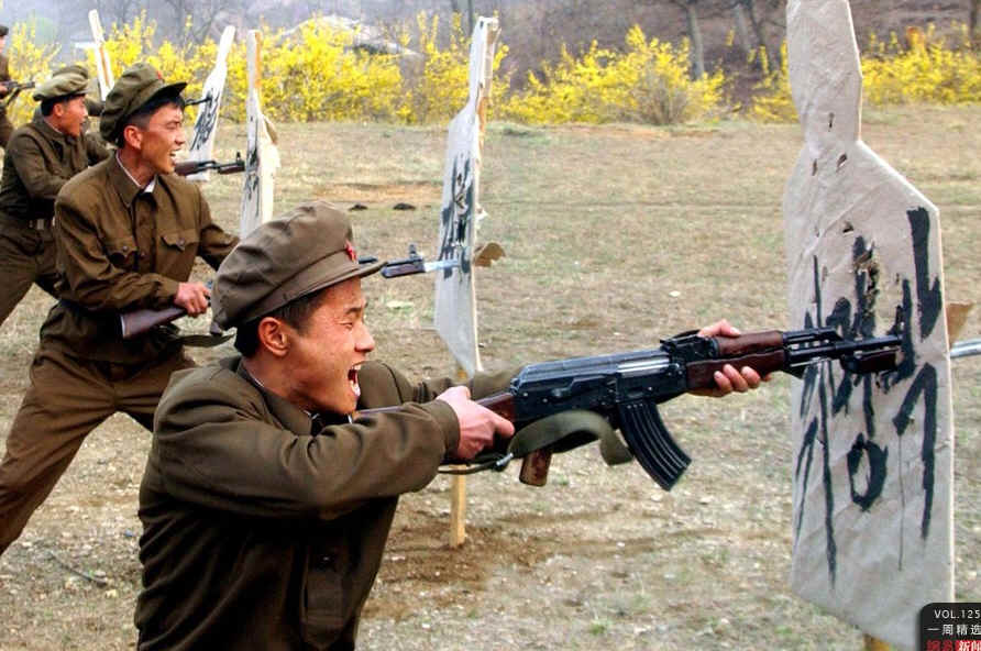 当地时间4月23日,朝中社公布的照片,朝鲜平壤,朝鲜士兵用刺刀狂刺写有“李明博是卑鄙小人”的靶子。IC