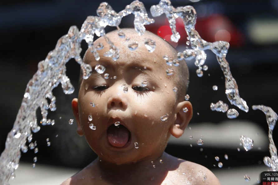 当地时间4月24日,菲律宾首都马尼拉,一名小男孩用水柱避暑。REUTERS/Cheryl Ravelo