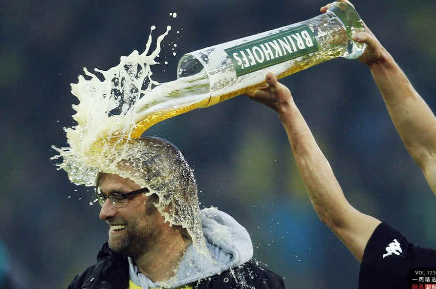 当地时间4月22日,多特蒙德后卫皮什切克将整整3升的一大杯啤酒从教练克洛普的头顶倒下。当日,多特蒙德夺得本赛季德甲联赛冠军,教练与队员纷纷泼啤酒庆祝胜利。REUTERS/Ina Fassbender