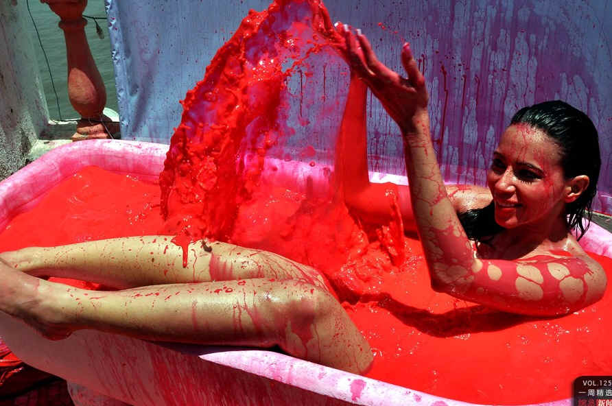 当地时间4月23日,印度孟买,宝莱坞女演员Rozlyn Khan在盛满红色液体的浴缸中沐浴,以此呼吁人们善待动物。当日,善待动物组织在印度举行了一系列的活动,抗议人们用动物做实验。AFP PHOTO/STR