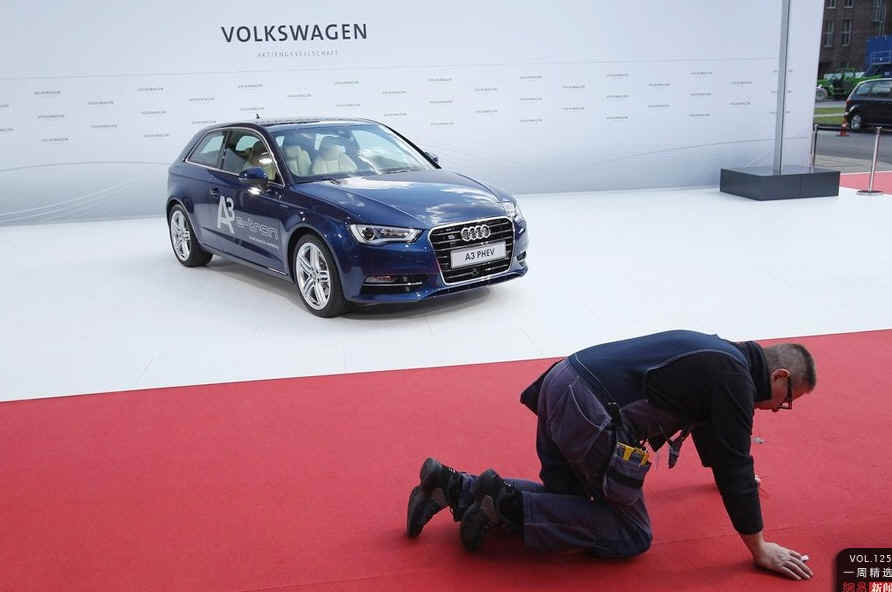 4月23日,德国沃尔夫斯堡大众汽车公司,为迎接温家宝的来访,一名工人在展台前做最后的准备工作。Sean Gallup/Getty Images
