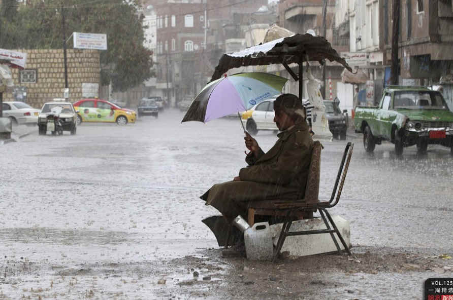 当地时间4月23日,也门首都萨那,一名反对派士兵在雨中驻守着通往变革广场的要道。变革广场是示威者们的大本营,他们已经在广场上驻扎一年,要求政府下台。REUTERS/Mohamed Al-Sayaghi