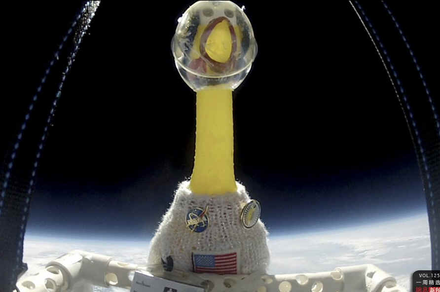 美国宇航局(NASA)4月22日公布的视频截图显示,一只塑料鸡“乘坐”氢气球升至加利福尼亚州上空3万米处。NASA称,该塑料鸡将被用于太阳辐射的研究。REUTERS/NASA