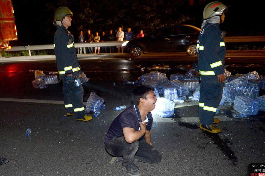 4月25日,成都绕城高速发生一起车祸,死者的儿子跪在地上痛哭,并央求救援人员挽救其母亲。当日发生的货车侧翻事故使一名女子被甩出车外,压在货车右后轮下,当场身亡。CFP