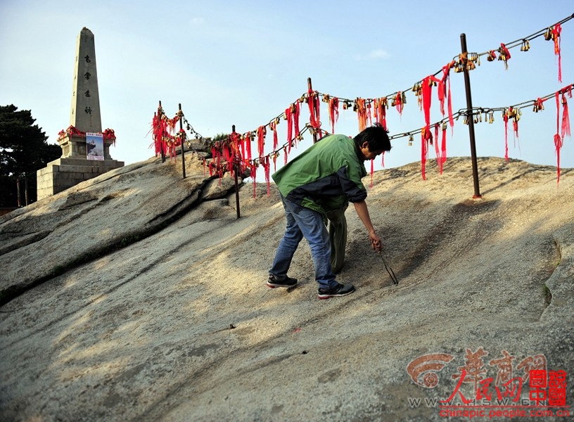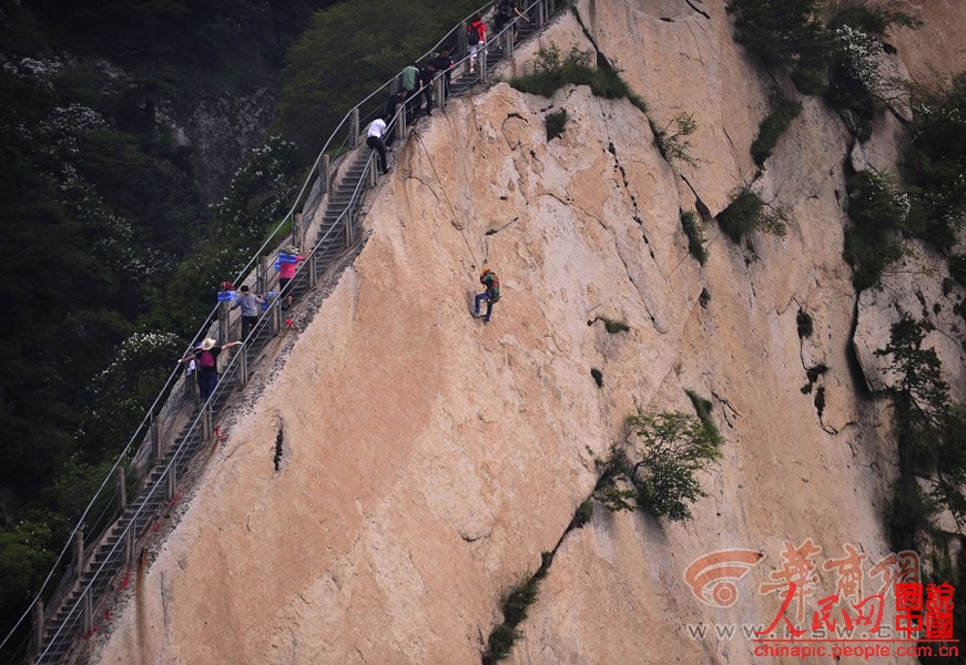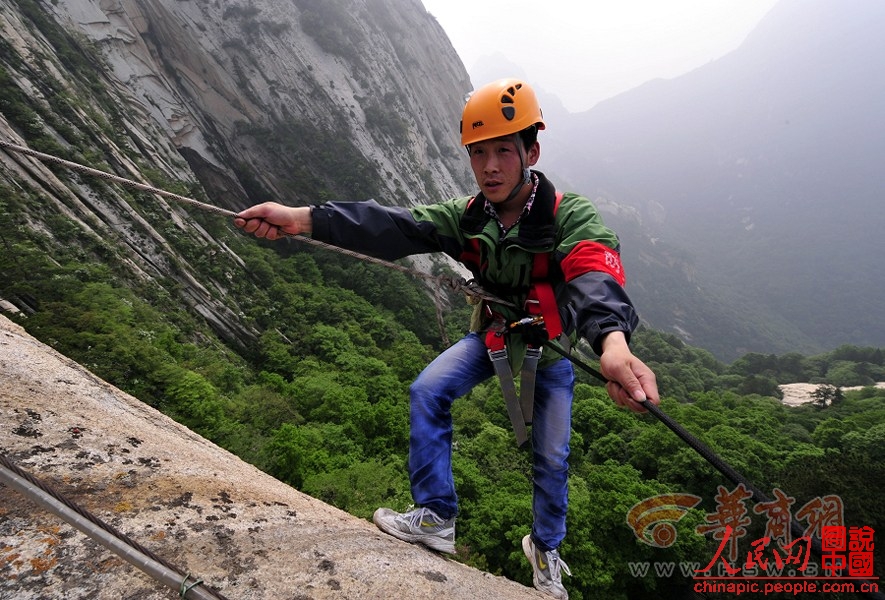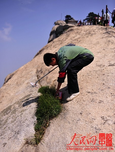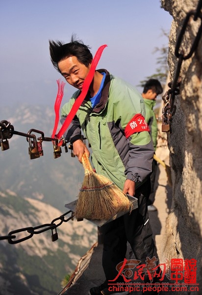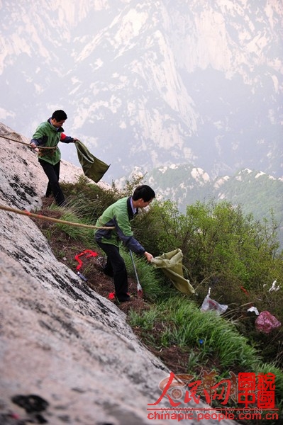 华山以险峻而闻名天下,在苍龙岭,东峰,西峰,五云峰等危险处的悬崖边上,经常见到身系绳索头戴安全帽,在悬崖上忽上忽下,捡拾垃圾的环卫工。他们是华山上的清洁工,在峭壁上捡拾被游客随手扔掉的垃圾。也劝阻过意图在此自杀的人,仅2011年,这些华山清洁工就劝阻46名自杀者。