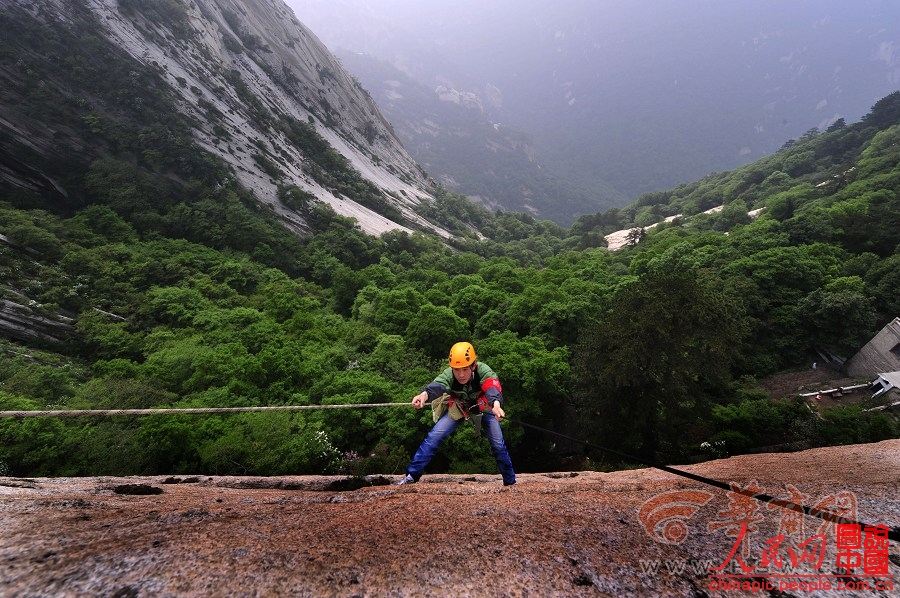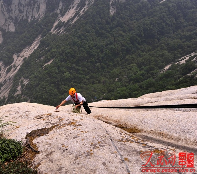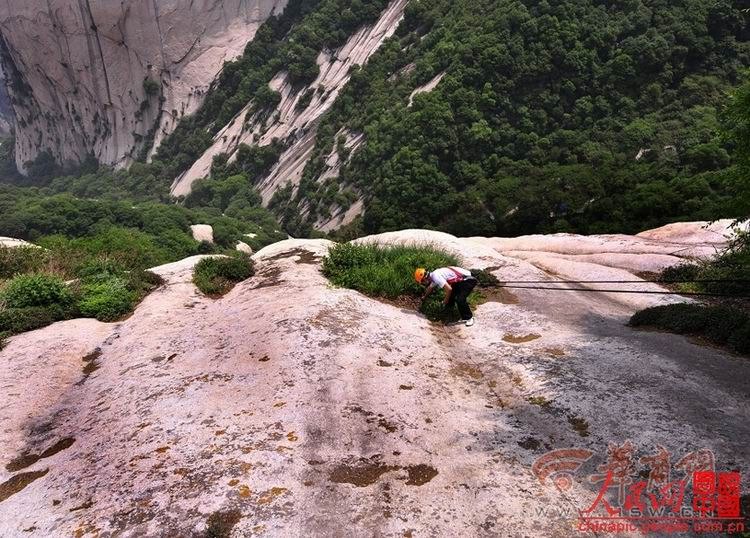41岁的杨武军记不清楚是第多少次下悬崖了。他是华山北峰管理站的一名普通的环卫工人,负责的区域只有短短200米,可这200米却都是在华山的悬崖峭壁之间。