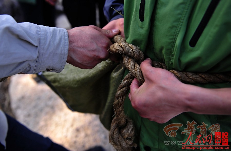 环卫工还帮过不少受伤的游客,甚至挽回过轻生者生命,仅2011年就成功劝阻自杀者46起。一名环卫工正在“放绳下沟”。