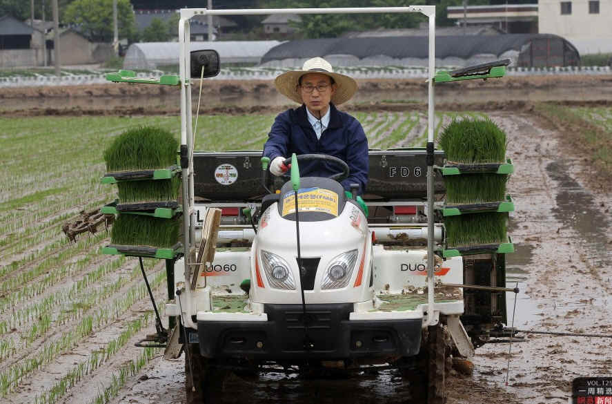 当地时间5月24日,韩国全罗北道,总统李明博到当地视察农业,视察中他戴草帽穿雨鞋亲自驾驶插秧机。IC