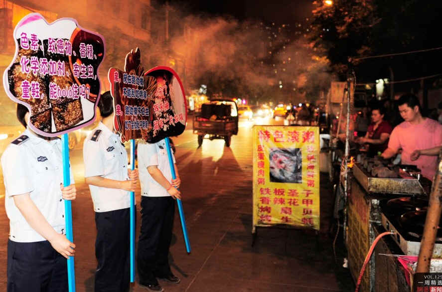 5月16日,武汉江岸区城管队员,对占道摊贩不开罚单、不暂扣,而是举起7块由网络体语言写成的宣传牌,在占道摊贩眼前来回走动。CFP